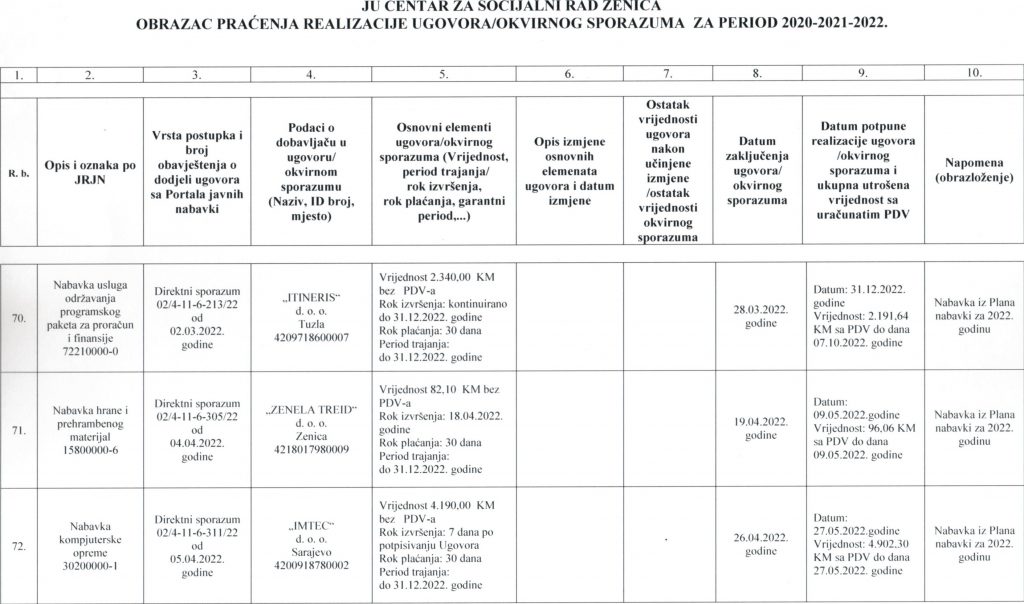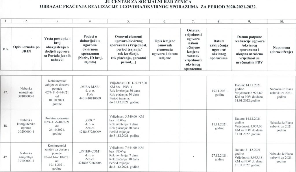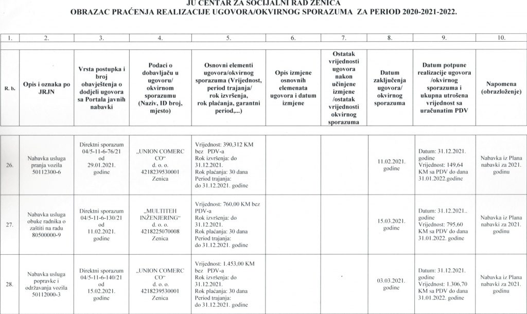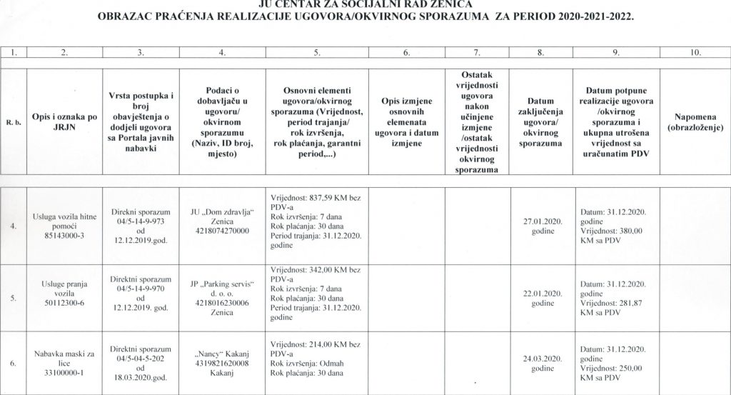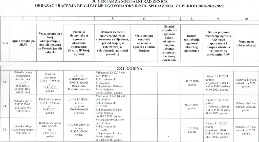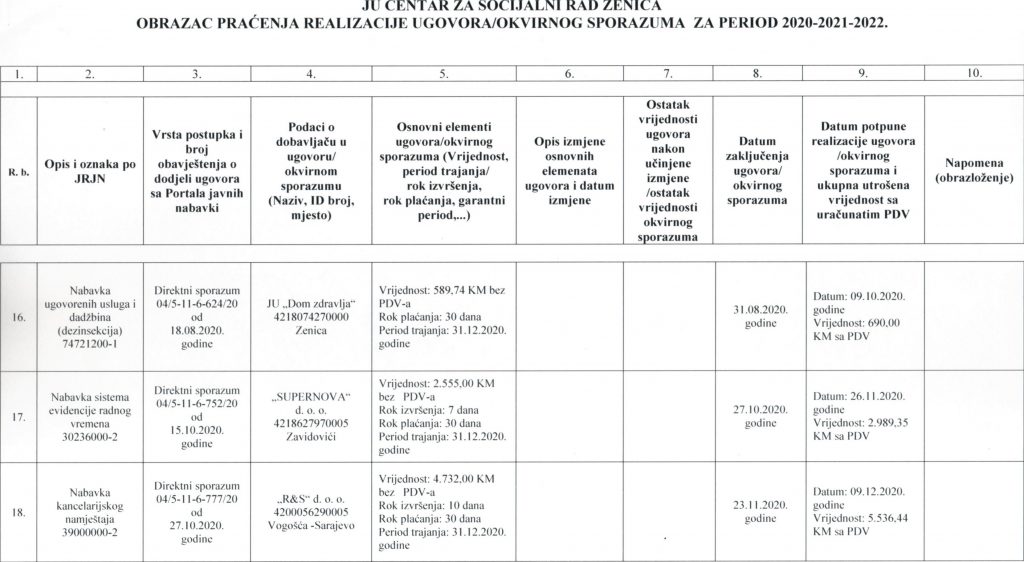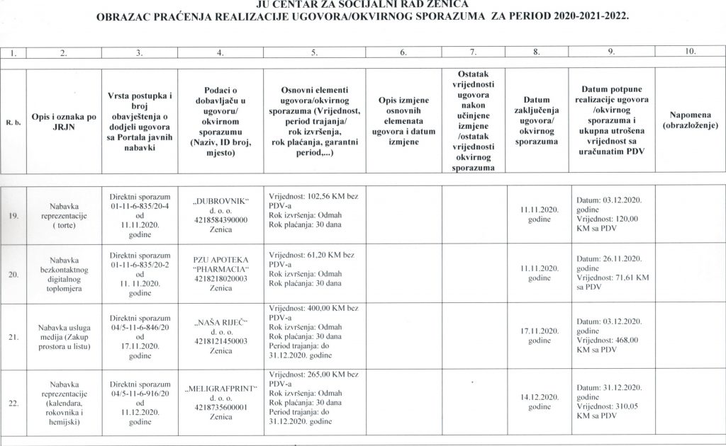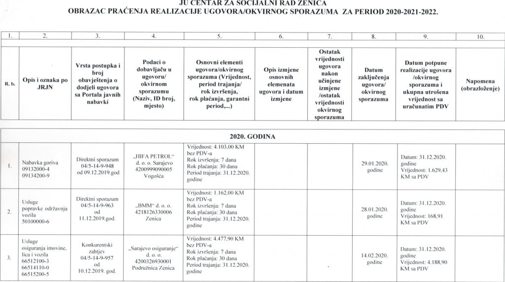 Obrazac praćenja i realizacije ugovora/okvirnog sporazuma za period 2020-2021-2022. godine