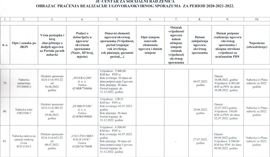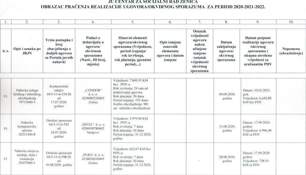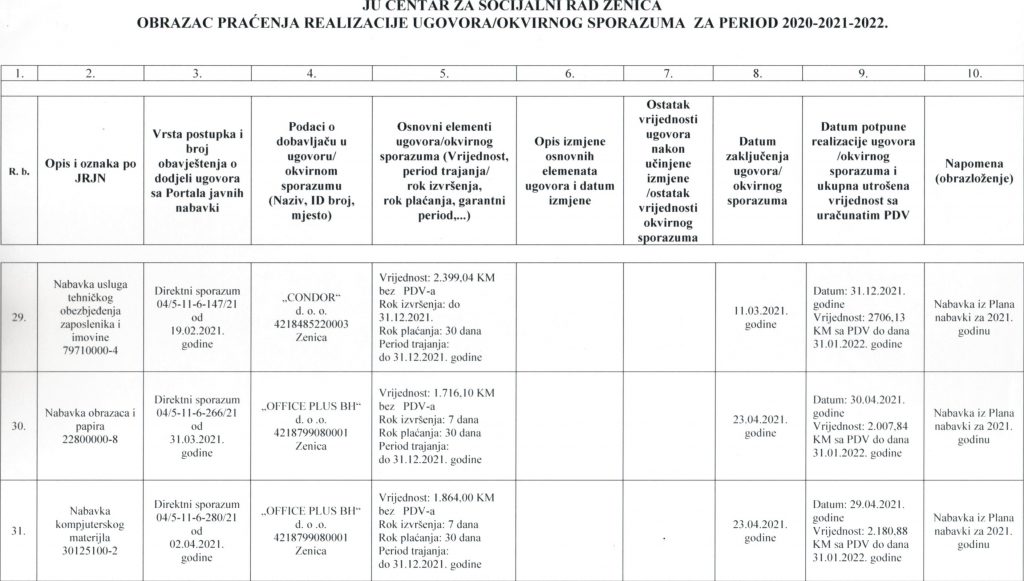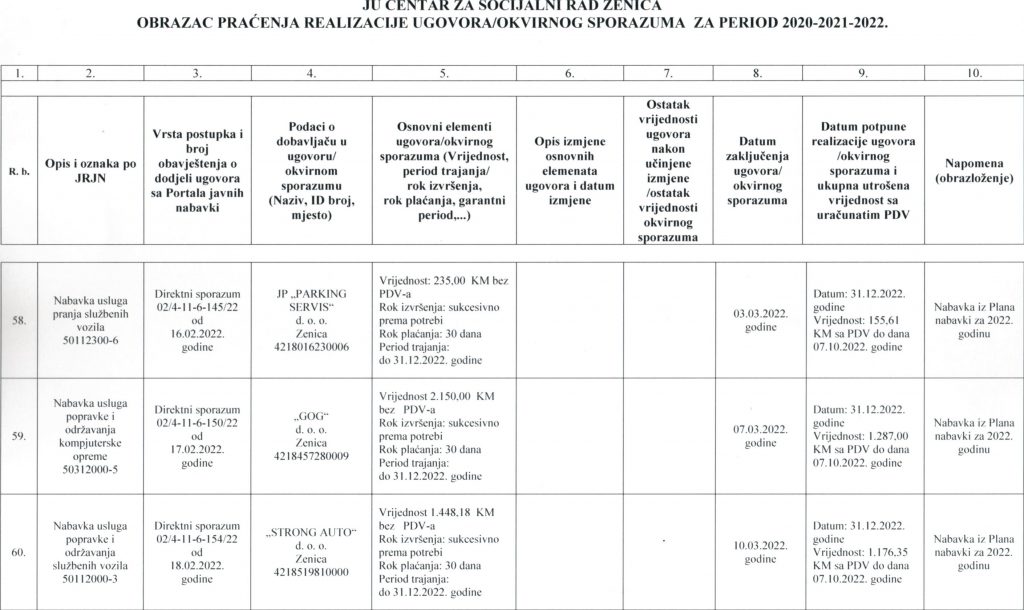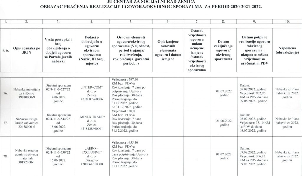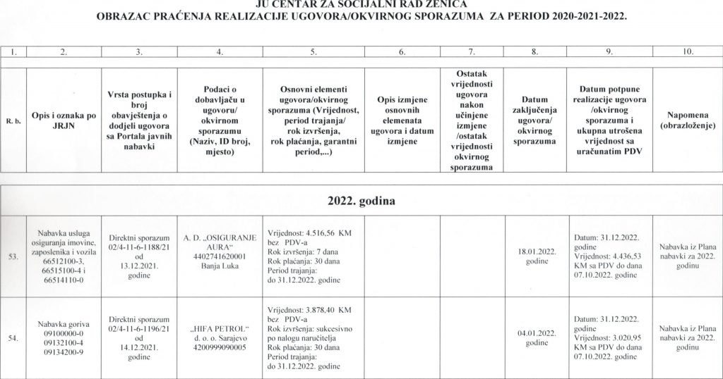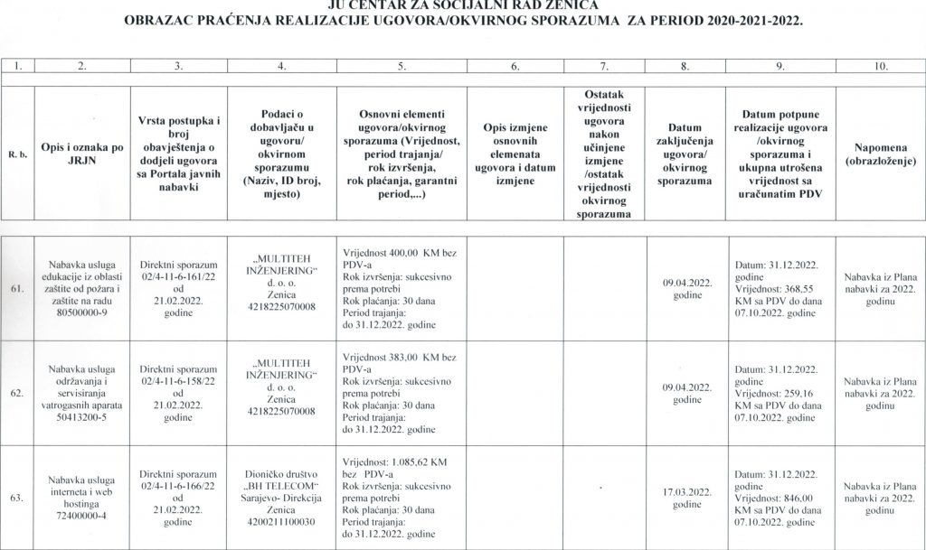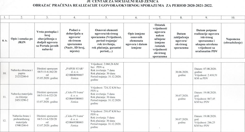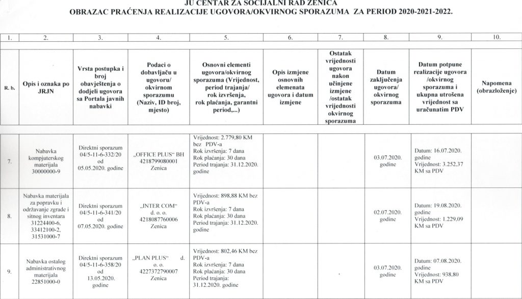 Obrazac praćenja i realizacije ugovora/okvirnog sporazuma za period 2020-2021-2022. godine