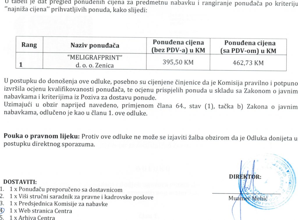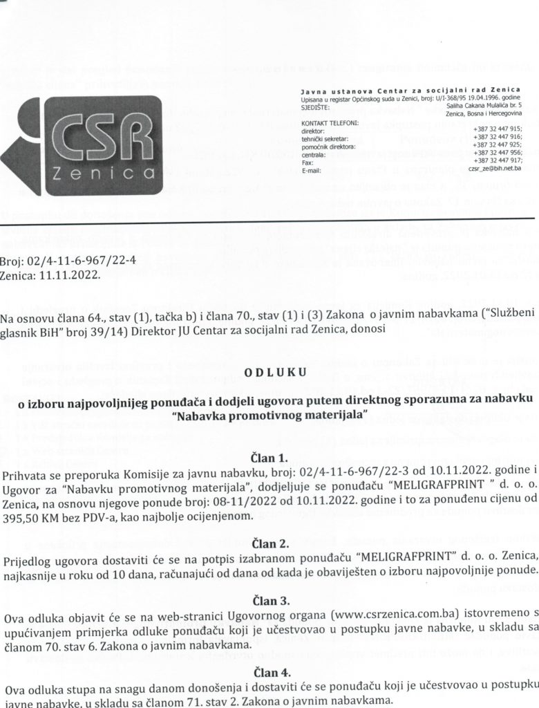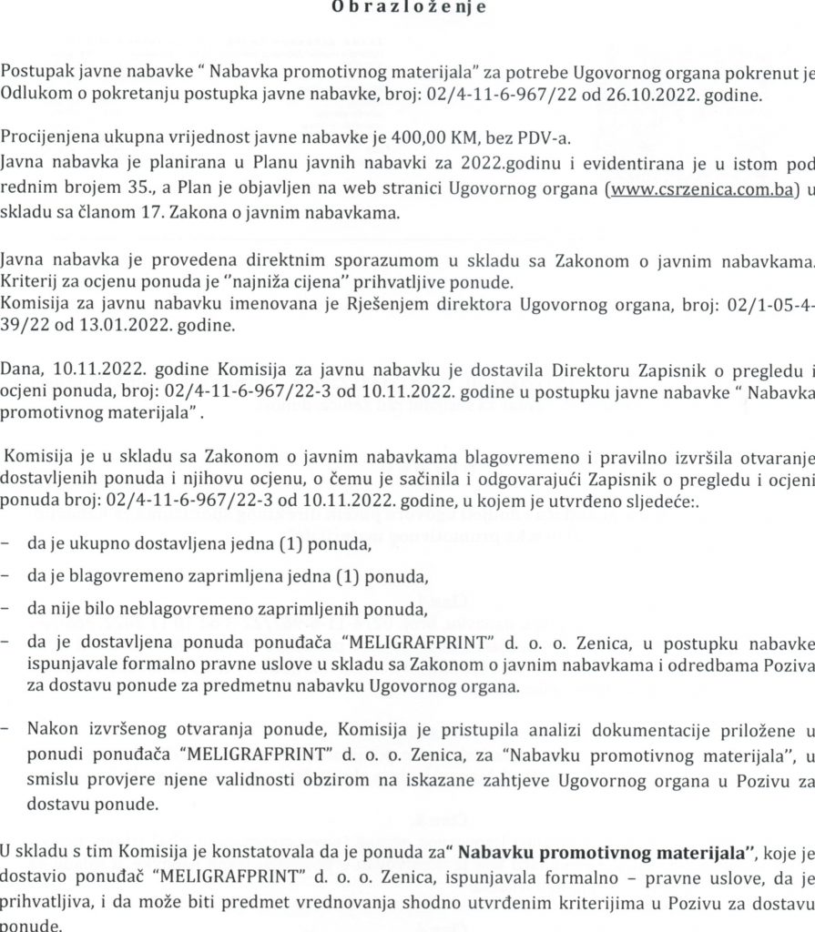 Odluka o izboru najpovoljnijeg ponuđača i dodjeli ugovora putem direktnog sporazuma za nabavku “Nabavka promotivnog materijala”
