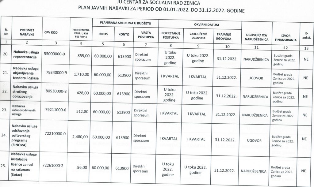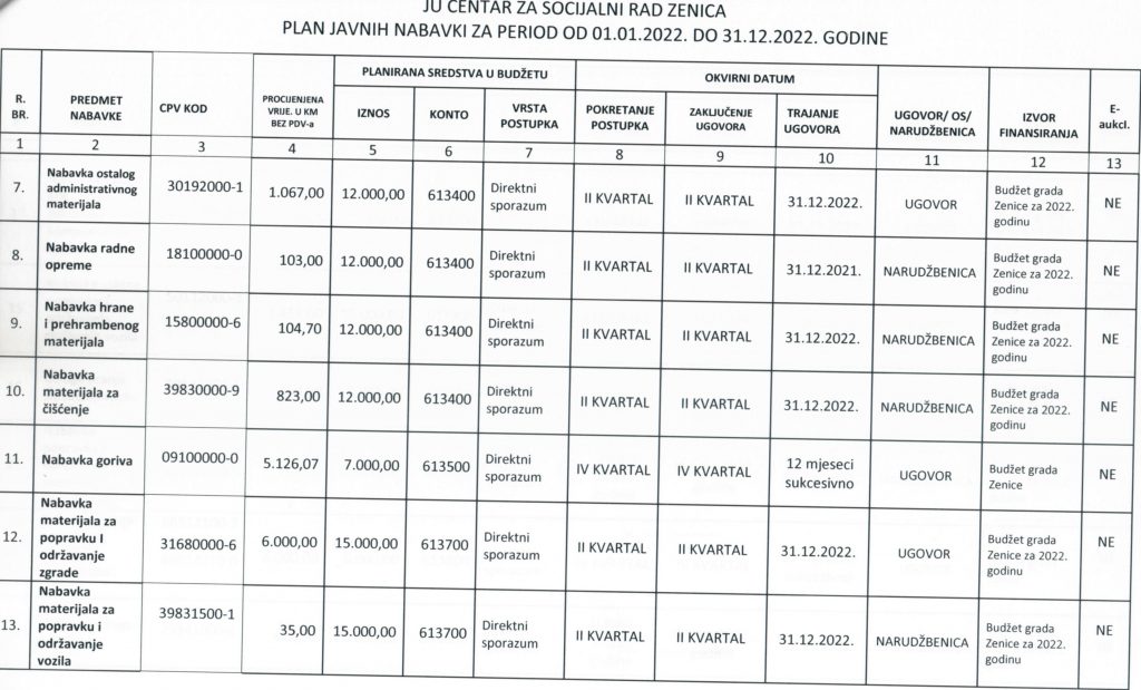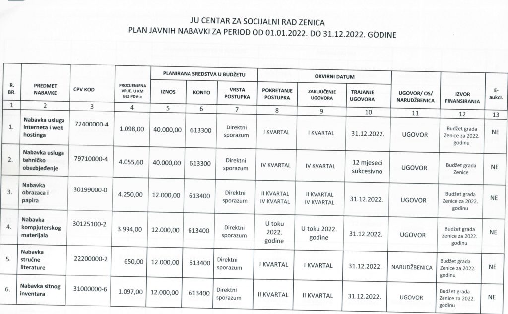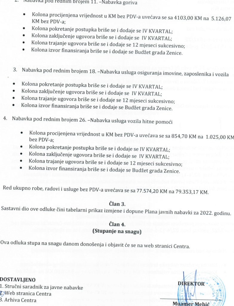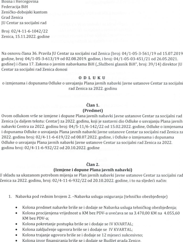 Odluka o izmjenama i dopunama Plana javnih nabavki JU Centar za socijalni rad Zenica za 2022. godinu
