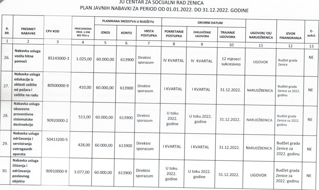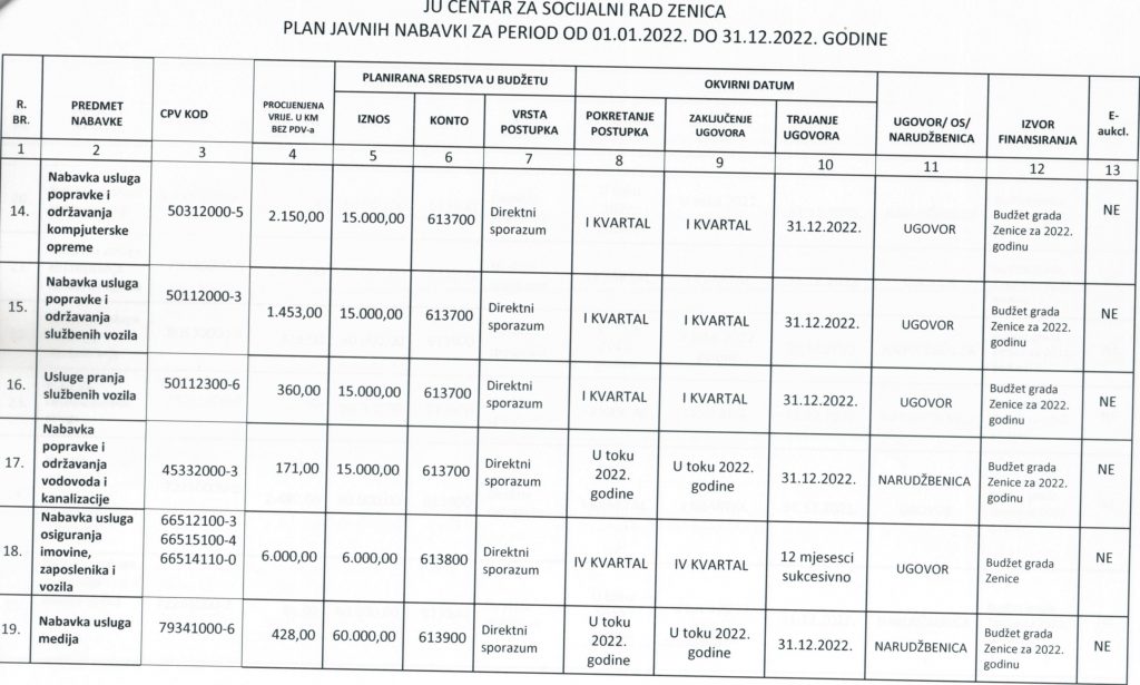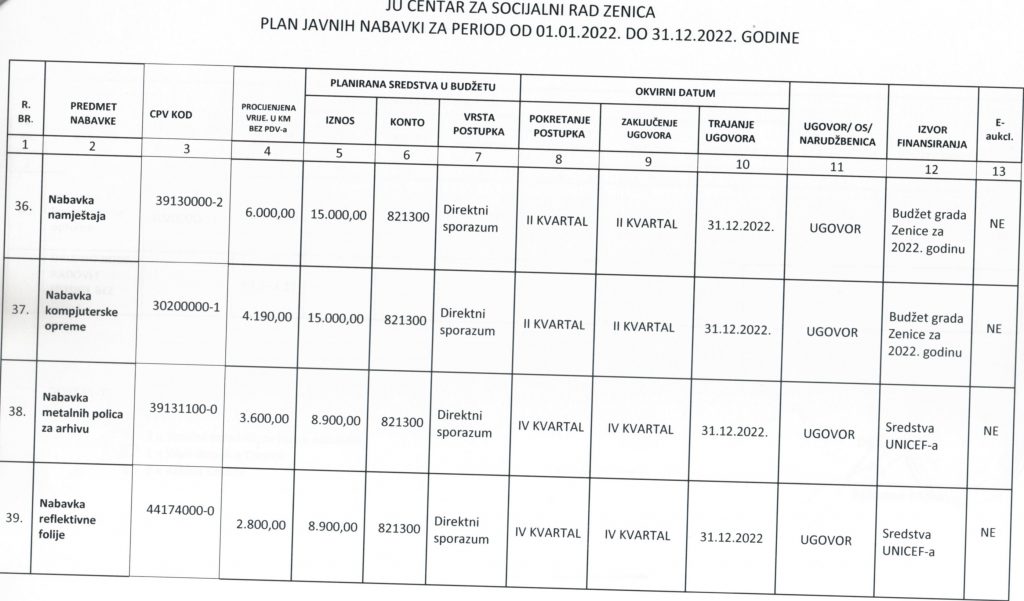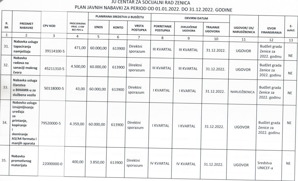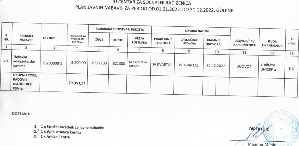 Odluka o izmjenama i dopunama Plana javnih nabavki JU Centar za socijalni rad Zenica za 2022. godinu