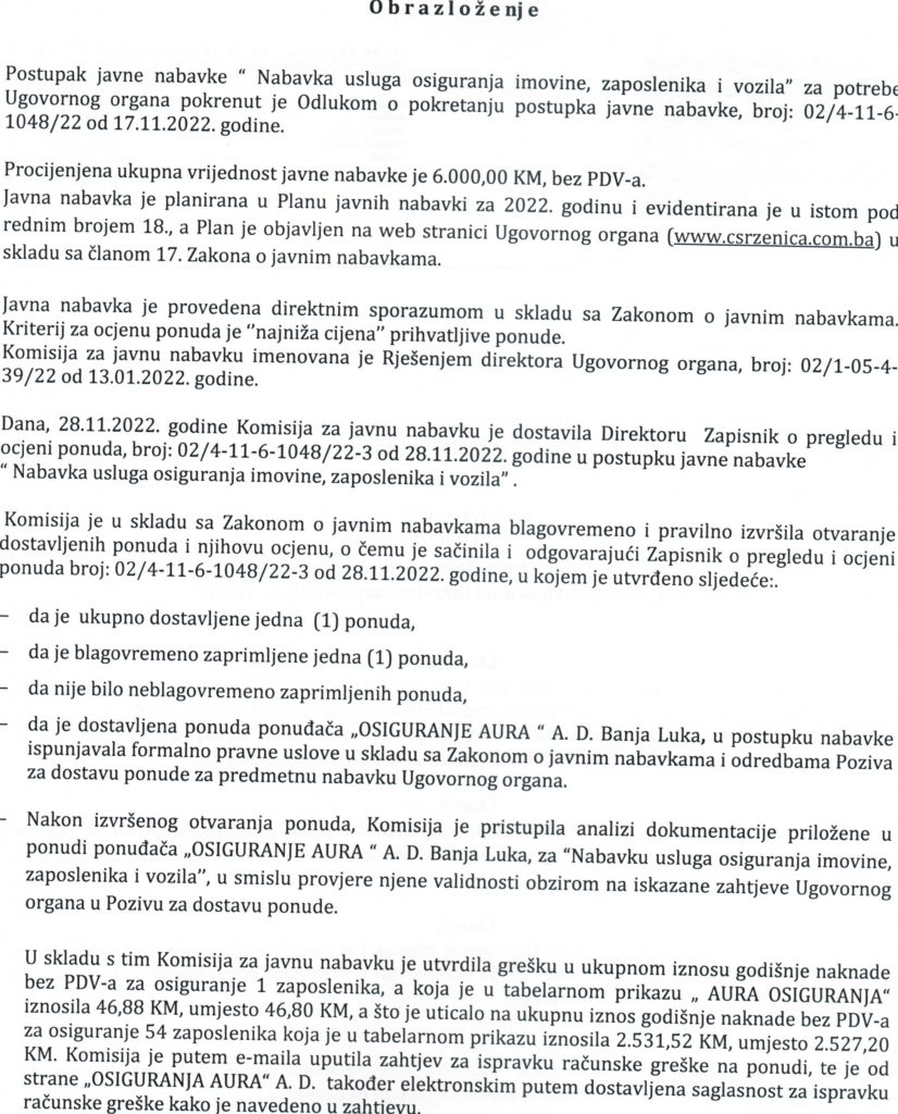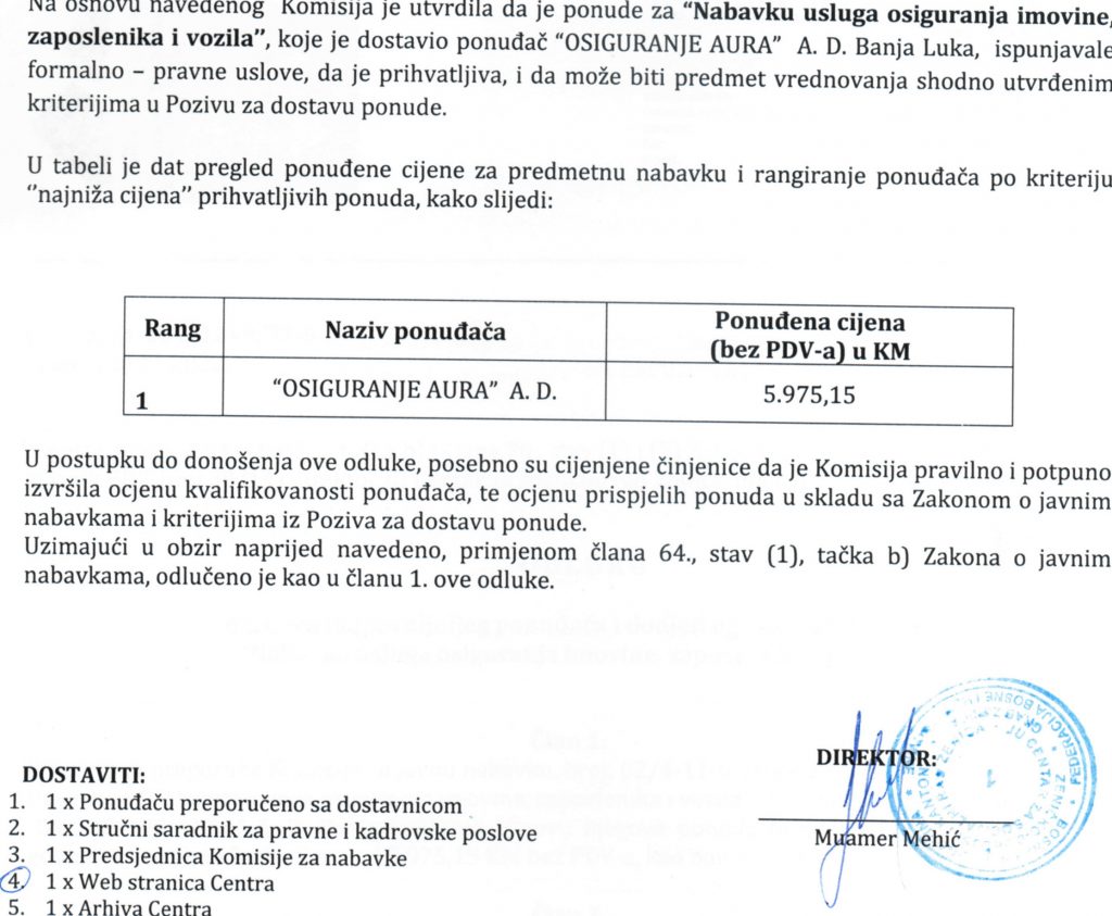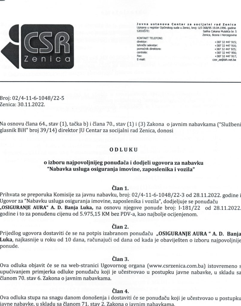 Odluka o izboru najpovoljnijeg ponuđača za nabavku usluga osiguranja imovine, zaposlenika i vozila