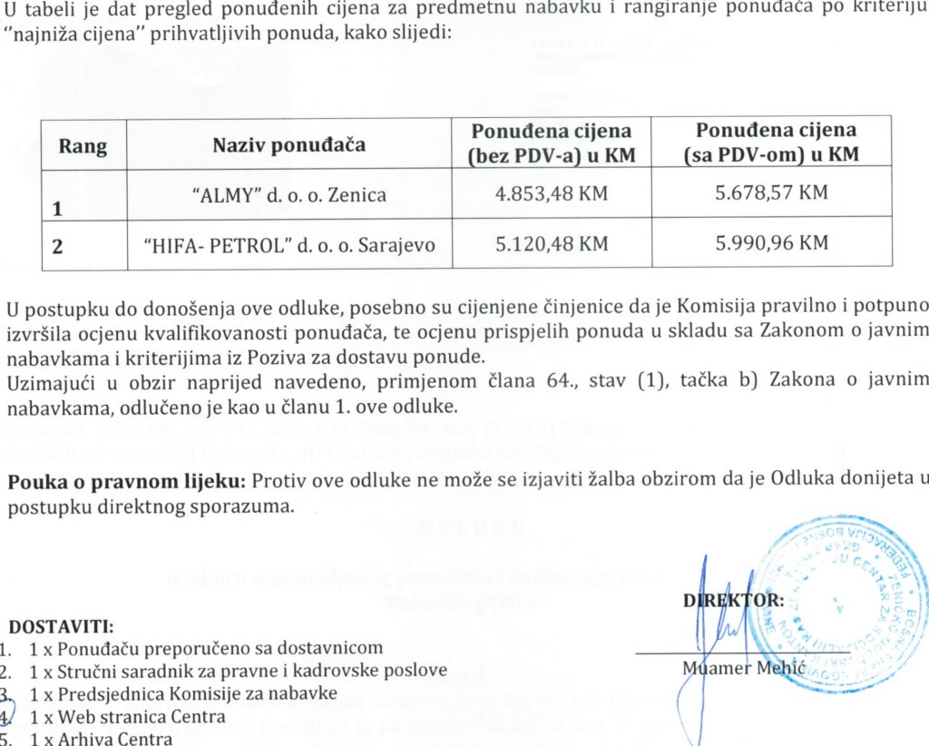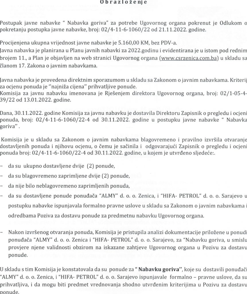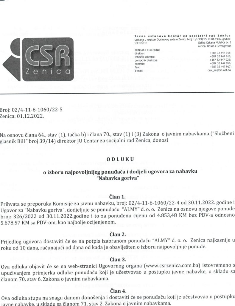 Odluka o izboru najpovoljnijeg ponuđača za nabavku goriva