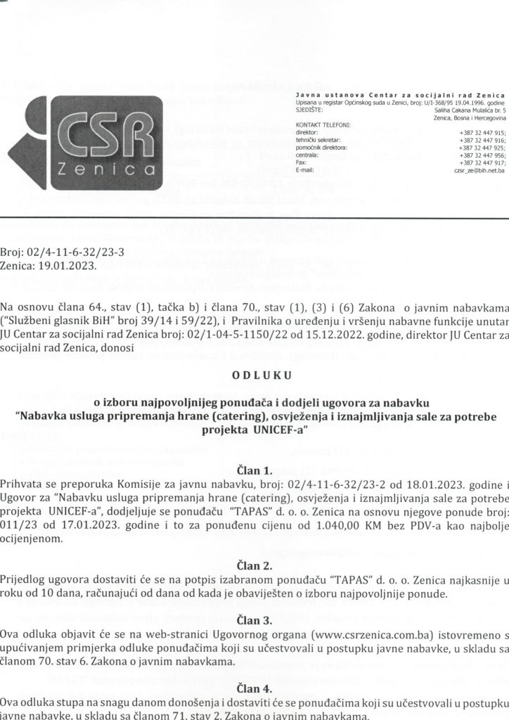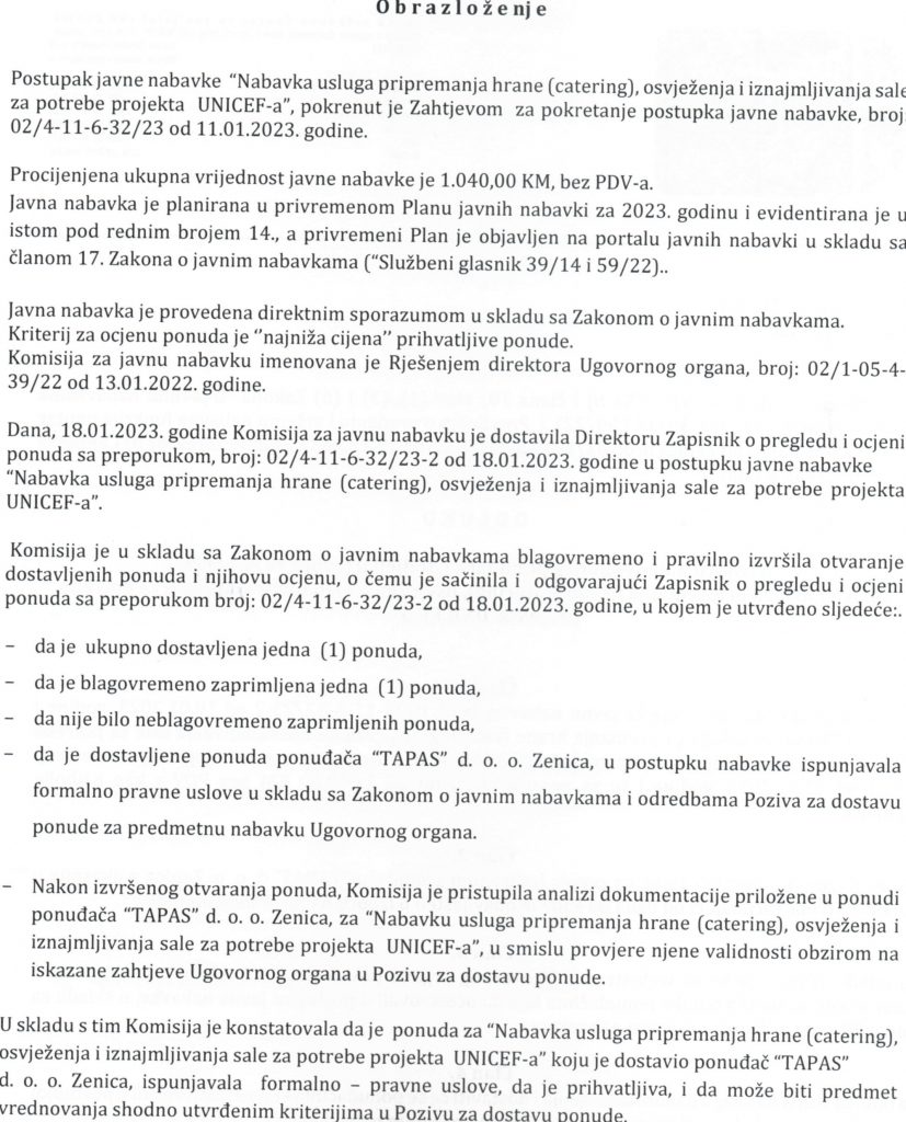 Odluka o izboru najpovoljnijeg ponuđača i dodjeli ugovora za nabavku usluga pripremanja hrane (catering), osvježenja i iznajmljivanja sale za potrebe projekta UNICEF-a