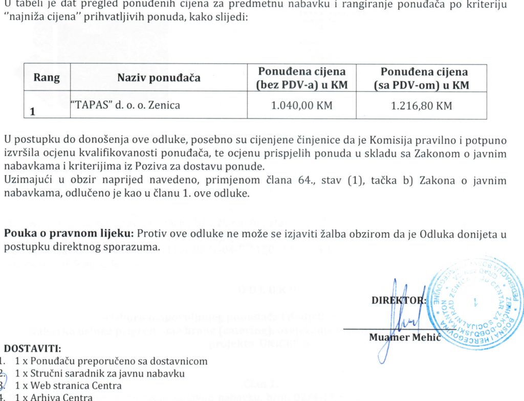 Odluka o izboru najpovoljnijeg ponuđača za nabavku usluga printanja, kopiranja i skeniranja A3/A4 formata uz najam (zakup) multifunkcionalnih uređaja