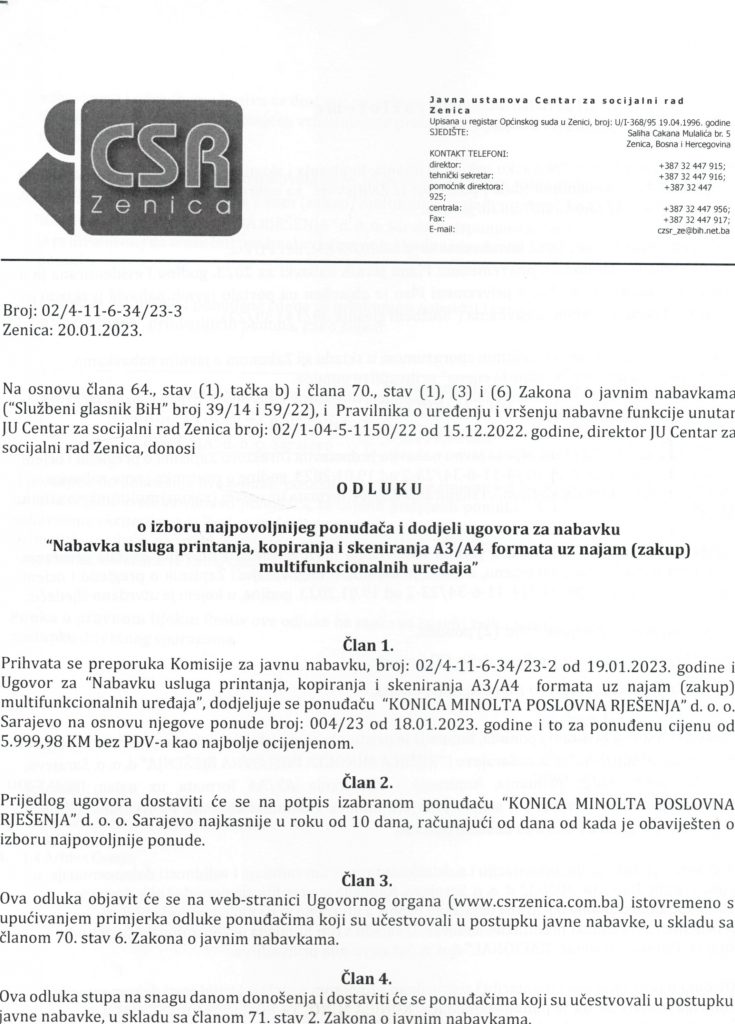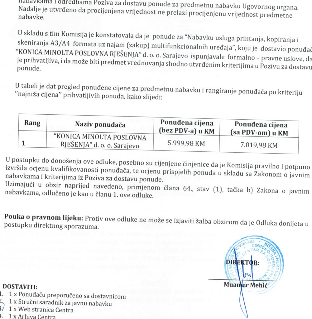 Odluka o izboru najpovoljnijeg ponuđača za nabavku usluga printanja, kopiranja i skeniranja A3/A4 formata uz najam (zakup) multifunkcionalnih uređaja